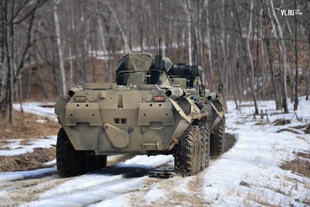Estas fotos las guardé en el ordenador en marzo de 2018, pero se me olvidó subirlas al blog. En ellas se pueden ver a vehículos de transporte de infantería (VTI) BTR-82A realizando ejercicios en Rusia. Los vehículos pertenecen a la Infantería de Marina del Mar Pacífico.